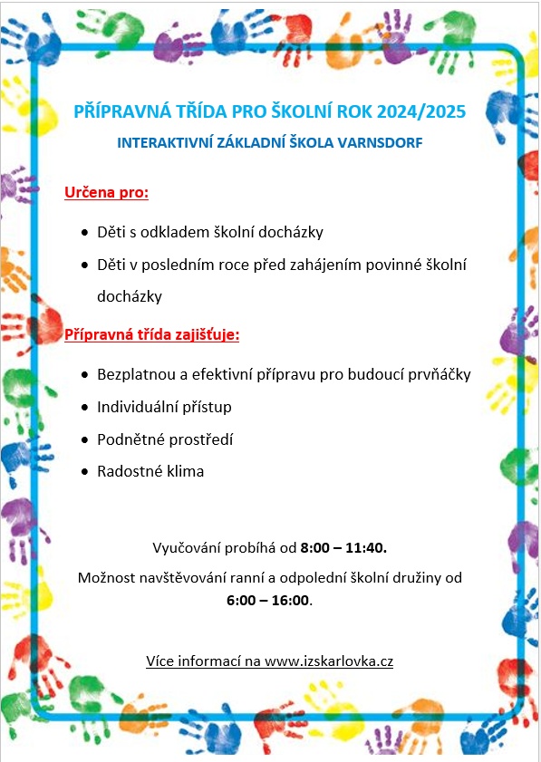 Home > Články > Informace pro rodiče > Představujeme přípravnou třídu Představujeme přípravnou třídu 21.2.2024 Naše škola nabízí předškolní vzdělávání dětí v přípravné třídě. Přípravná třída [450,18 kB] Zpět